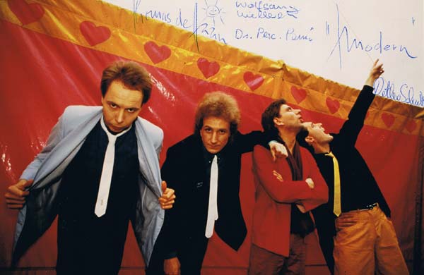 fing alles an? Kurze Zeit später war es soweit, mein erster Bass wurde gekauft. Aus Kostengründen allerdings ein Instrument vom Versandhaus Quelle, mit dem ich lange ein altes Röhrenradio und danach einen selbst gebauten Kofferverstärker quälte. Dann wurde aufgerüstet. Der Hagström-Bass wurde gekauft und eine Selmer Bassanlage. Natürlich auf Raten. 30,00 DM im Monat und die Eltern bürgten. Am Anfang stand, wie bei fast allen Musikern, die sogenannte Schülerband. Es gab die ersten musikalischen Gehversuche in Form von Nachspielen. Es gab viele Auftritte und man erspielte sich in den Clubs reichlich Routine. Schon damals waren Musiker der späteren Modern-Besetzung dabei: Peter Miklis am Schlagzeug und Thomas de Haan an der Gitarre. Ich wollte aber immer tiefer eintauchen als meine Mitmusiker, deshalb suchte ich damals mit Peter Miklis einen Gitarristen um die Sache professionell anzugehen. Es wurde die Band Waterloo und gleichzeitig eine WG gegründet. Schließlich kam dann Alfred Mühlböck aus Österreich zu uns. Wir haben hart gearbeitet und versucht, komplizierte Musik zu verkaufen. Das konnte nicht klappen. Alfred ging damals zu Novalis und Peter studierte Musik. Es gab noch einige weitere Besetzungsversuche aber ohne Ergebnis, Waterloo löste sich auf. Dann wurde die Band "Cube" gegründet, in der neben mir auch wieder Peter Miklis dabei war. Mit folgender Besetzung startete man einen weiteren Versuch: Wolfgang Mielbrett (Bass), Jochen Scheel (Gitarre), Peter Miklis (Schlagzeug) und Rüdiger Wiskemann (Keyboard). Die Musik war sehr Gesangsbetont, aber wie es so in den 70er-Jahren war, auch kompliziert. Yes und Genesis waren hier wohl die Vorbilder. Mit dieser Besetzung gab es dann auch die ersten Kontakte zur Industrie. Verlage und Produzenten wurden auf uns aufmerksam. Zu dieser Zeit lernten wir Dirk Steffens kennen. Ehemals Gitarrist bei Birth Control und Studiobesitzer. Dirk war damals mit einem Projekt namens "TRIO" beschäftigt. Er redete auf uns ein es mal mit deutschen Texte zu versuchen. Dabei spielte er uns Demos von Trio vor. Er behauptete, dass diese Musik im Kommen ist. Wir waren damals von unserer Rocksülze mit englischen Texten zu sehr überzeugt und machten so auch erfolglos weiter. Viele Auftritte, aber keinen Plattenvertrag. So löste sich auch "Cube" wieder auf. Anfang der 80er-Jahre wollte ich etwas Neues machen und dann auch deutsche Texte verwenden. Die Neue Deutsche Welle war im Anmarsch, Modern wurde gegründet. Mit neuen Musikern wollte man aus dem Lübecker Dunstkreis ausbrechen. In Hamburg fand ich Otto an der Gitarre (Nachnamen entfallen) und Gregor Ahrens am Schlagzeug. Detlev Schult war neben mir der einzige Musiker aus Lübeck. Wir merkten schnell, daß die Gitarrenarbeit von Otto einfach zu rockig war und kamen dann doch wieder auf Lübecker Musiker zurück. Mein alter Bekannter, Thomas de Haan, stieg ein. Nach