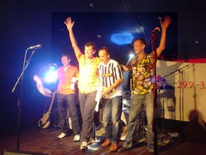 Immer noch unter dem Motto "Back from Togo" sind die United Balls leider viel zu selten auf süddeutschen Bühnen unterwegs. Diesmal gaben die vier selbst ernannten "Matadore des Tonsports" ein Gastspiel beim Kulturfestival Amperitiv in Dachau. Das Veranstaltungszelt EchoDrom (klingt größer als es ist) war trotz etwas ungünstigen Rahmenbedingungen (Sonntagabend, Regenwetter) recht gut gefüllt, das anwesende Publikum - gemischt aus vielen alten und weniger neuen Fans - ging schon beim ersten Lied "Strolche vom Frauenholz" richtig mit. Was dann folgte, war ein wildes Potpourri ihrer Songs - Altes und Neues, Eigenes und Covers, Deutsches und Englisches - und das ganz United Balls typisch in einem irren Tempo und mit extremer Spielfreude präsentiert. Der Funke zum Publikum sprang sofort über - knapp die Hälfte der Anwesenden waren sowieso langjährige Fans der Band und wurden von der Band teilweise sogar namentlich begrüßt - die alten Hits wurden abgefeiert ("Seemann, Gisela, Sirius, Gänseblümchen, Barbarella, Ein Lied geht um die Welt") aber auch neuere Kompositionen wie "Natascha" bejubelt. Gipfel das